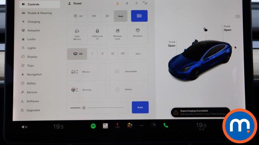 Like nearly every other control, turning on the fog lights is done through the touchscreen in a Tesla. Click the car icon in the bottom corner and go to the ‘Lights’ submenu to find the fog light buttons – or use the voice control and say “open light settings”.